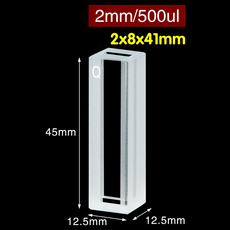 Quartz micro cuvette features a 2mm pathlength, 500μL volume, and Two-Way Light transmission. High transparency supports customization. Equipped with a PTFE cap for secure sealing. Ideal for precise spectroscopic analysis.