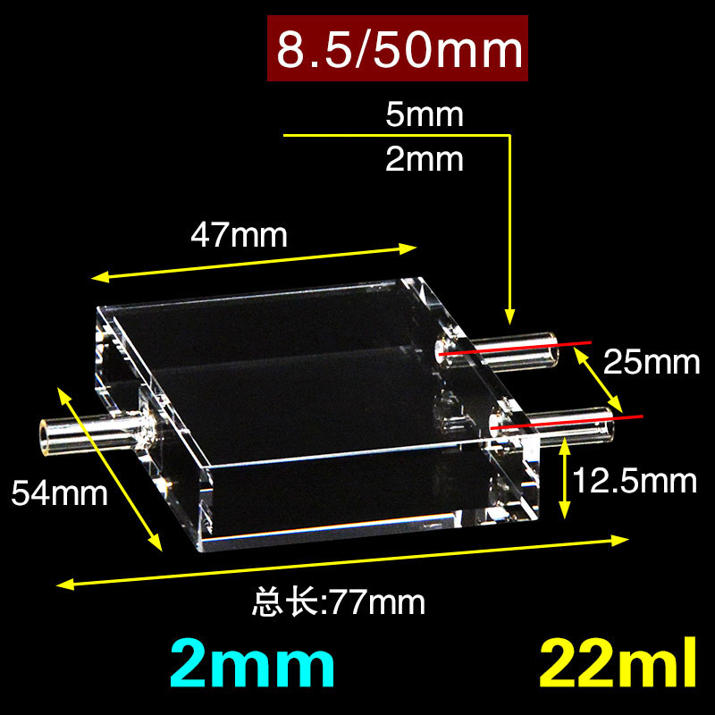 Quartz fluorescence flow cuvette, featuring dual pathlengths of 8.5/50mm and a 22ml capacity. The Four-Way Light design ensures ultraviolet transparency, offering customizable options for precise research applications.